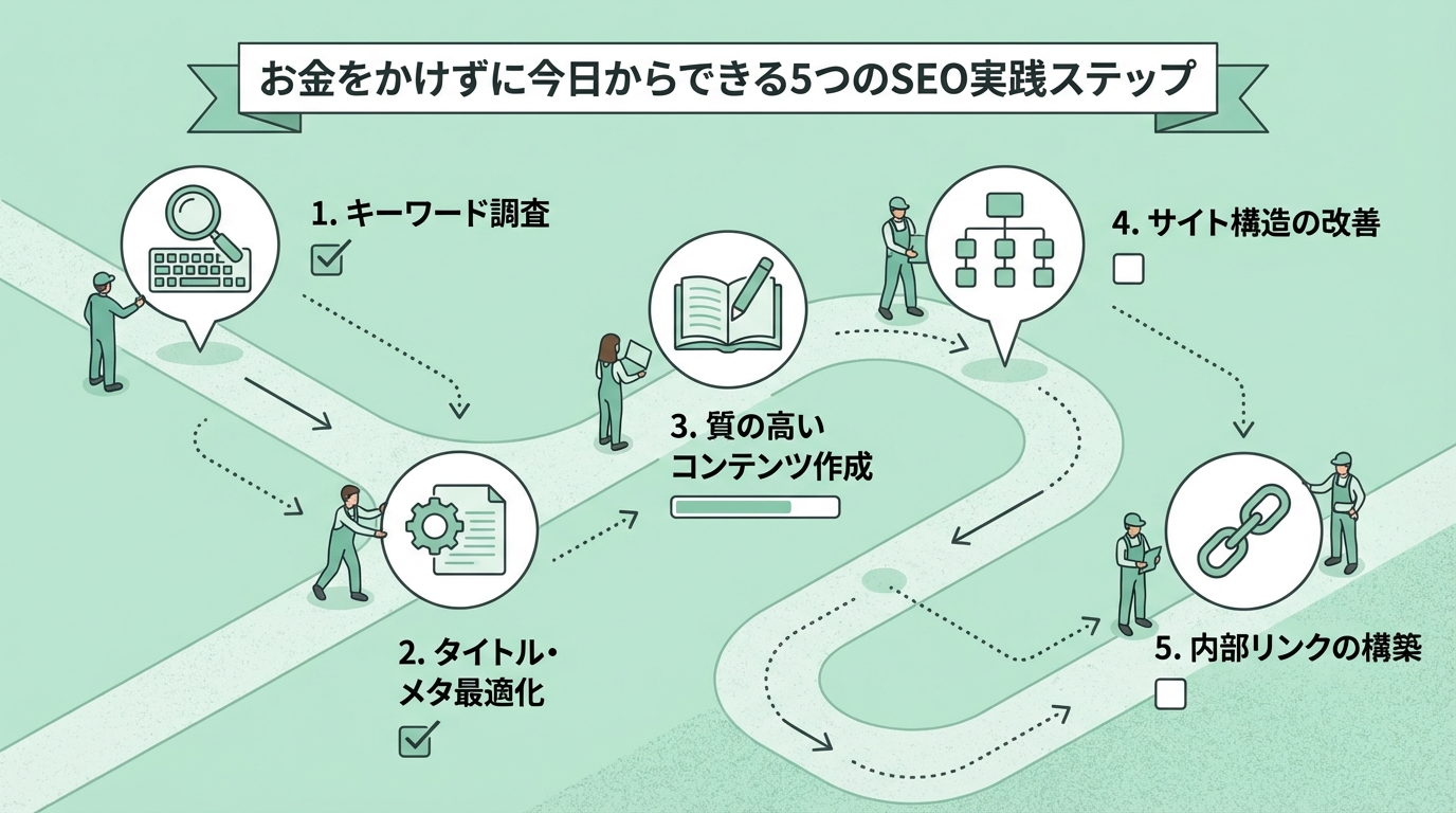 SEO対策は、無料ツールと自社の知見だけで十分に始められます。「SEOにはお金がかかる」って思ってる方も多いですけど、実は初期費用ゼロでもかなりのことができます。ここでは、今日からすぐ取りかかれる5つのステップを順番にお伝えしますね。