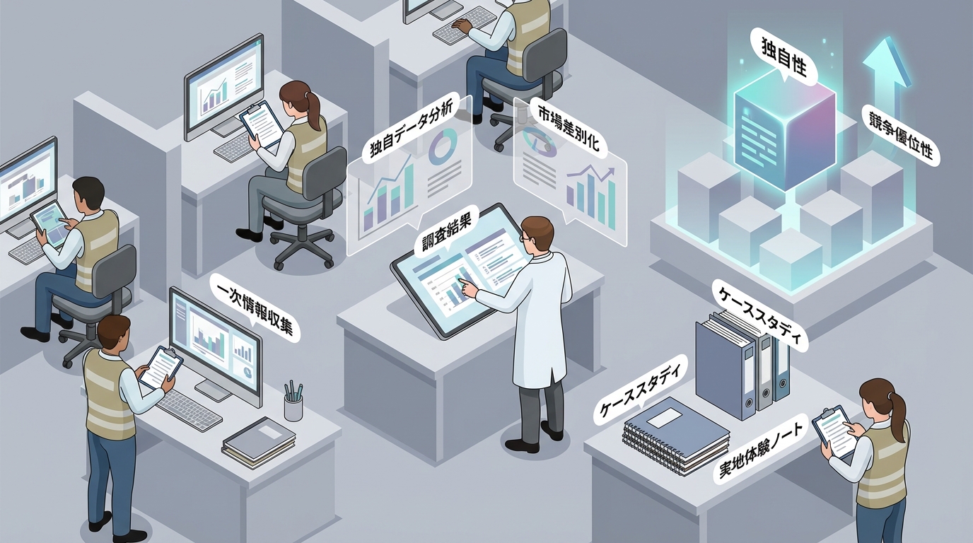 じゃあ「独自性」って具体的に何なのか。いくつかのパターンがあるので整理しますね。いちばん強力なのは一次情報——つまり自分自身の経験や、自社で収集したデータ、独自のアンケート結果などです。二次情報(他のサイトからの引用やまとめ)だけで構成された記事は、どうしても「どこかで読んだことがある」記事になりやすいんです。