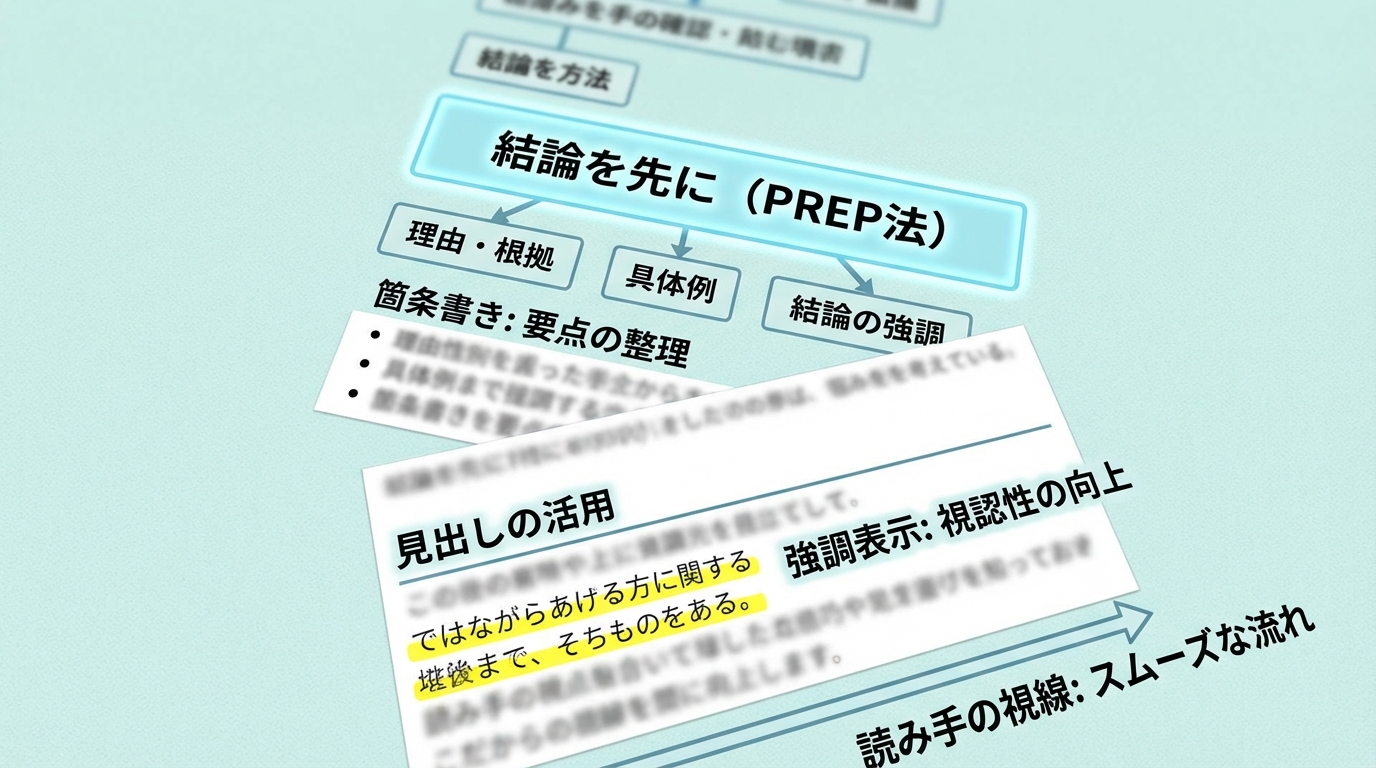 見出しの直後には「結論」を書く。これだけでスキャン読みの読者にも要点が伝わり、離脱率が下がります。