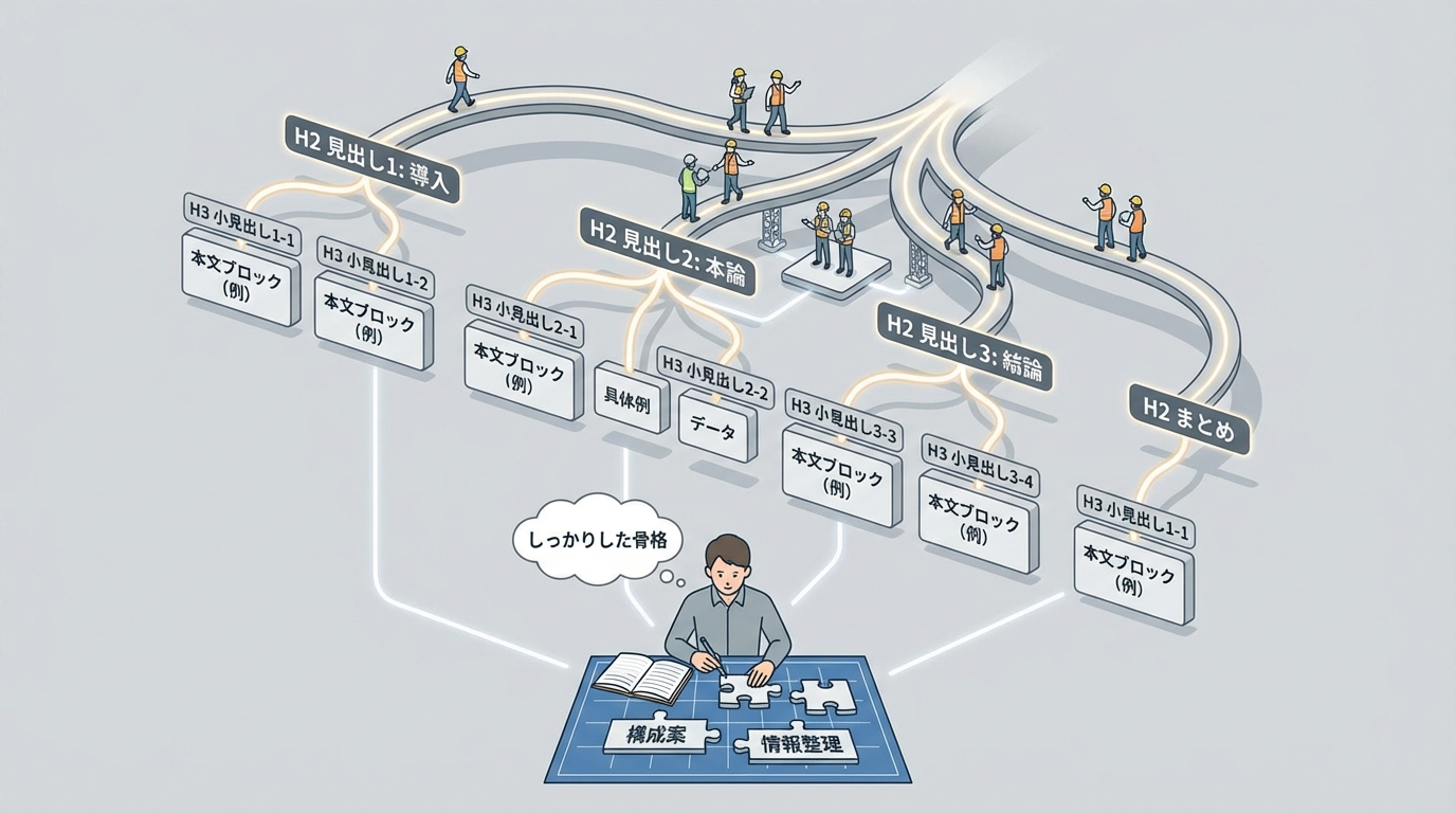 構成案の基本は、H2見出し(大見出し)とH3見出し(小見出し)の骨格を先に作ることです。まずH2で「この記事で伝えたいことの大きな柱」を並べて、各H2の中をH3で細分化していく。この時点では本文は一切書かなくてOKです。見出しだけを見て、「この記事の全体像が分かるか?」「読者の疑問に順番に答えているか?」をチェックするんですよね。