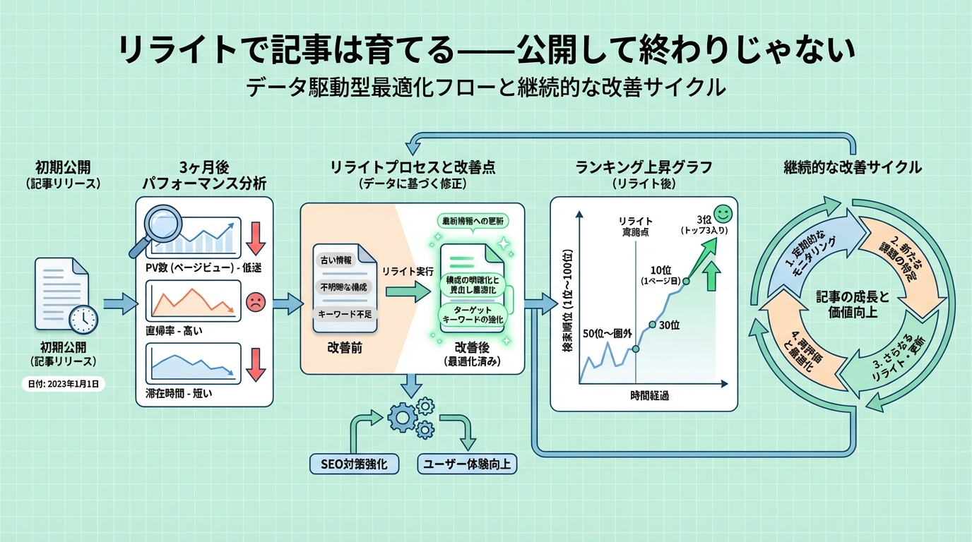 ➤まずは無料で相談してみる!(お気軽にご状況をお聞かせください)リライトで記事は育てる——公開して終わりじゃない