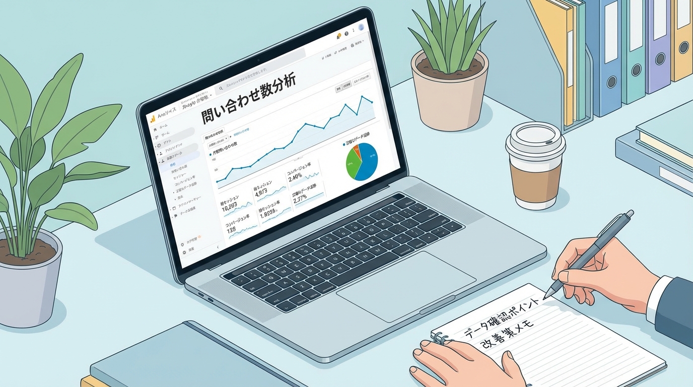 まずGoogle Analytics(GA4)で訪問数・フォーム到達率を確認し、Google Search Consoleで検索キーワードを分析します。これらは無料ツールなので、すぐに導入して月間訪問数・CVR・フォーム通過率の3つの数字を把握することから始めましょう。