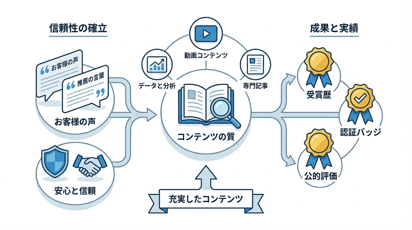 コンテンツの充実も信頼性に直結します。ブログやコラムで専門性のある情報を定期的に発信していると、「この会社は詳しいんだな」「ちゃんとした知識を持ってるんだな」と思ってもらえます。Googleの評価指標でもE-E-A-T(経験・専門性・権威性・信頼性)が重視されていて、専門的なコンテンツを持つサイトは検索順位でも有利になるんです。