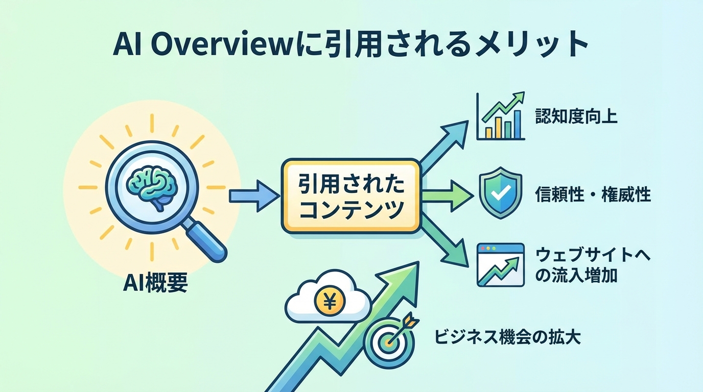 実務上は、AI Overviewに表示されることで「権威性」が高まる効果も見逃せないですね。